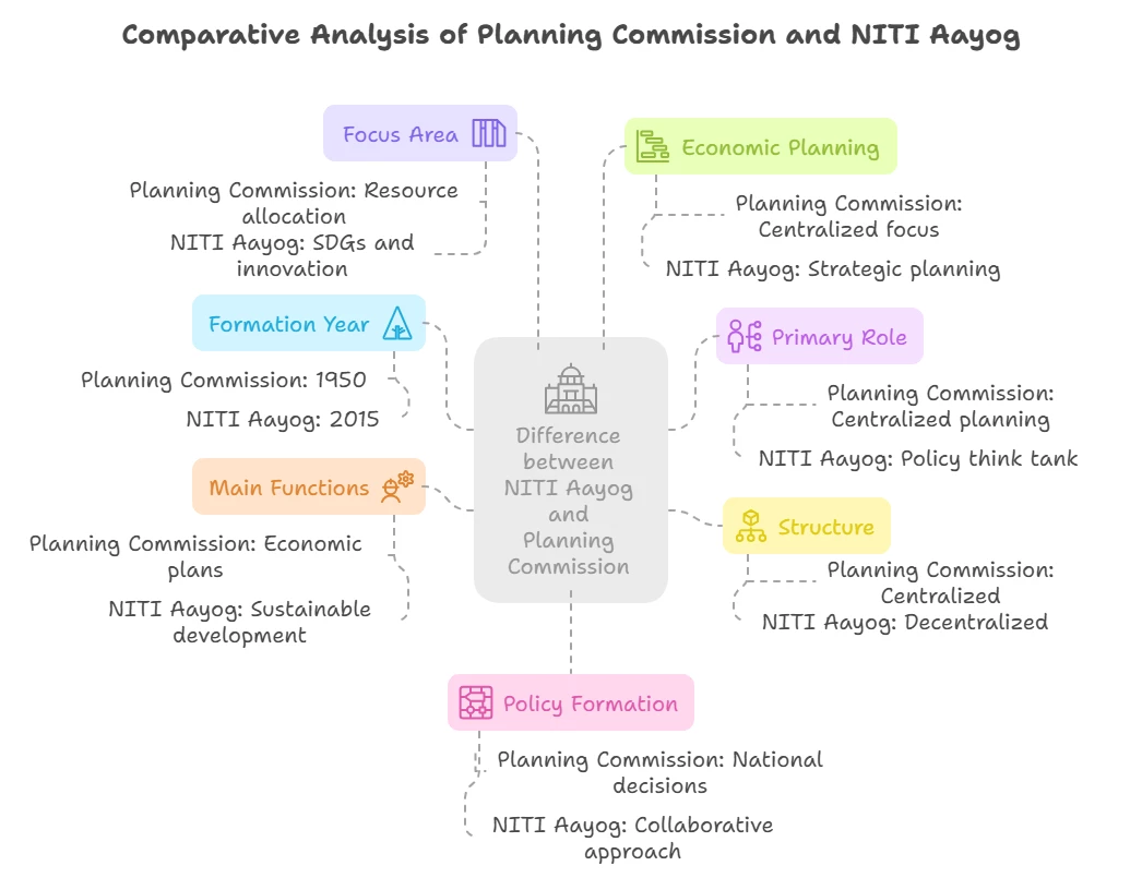 | The key difference between NITI Aayog & Planning Commission lies in their respective roles, governance structures, and objectives. NITI Aayog replaced the Planning Commission in 2015 to bring more flexibility, innovation, and cooperative federalism in India’s policy-making process. While the Planning Commission played a vital role in centralized economic planning, NITI Aayog focuses on encouraging collaborative federalism, holistic development, and strategic planning. |